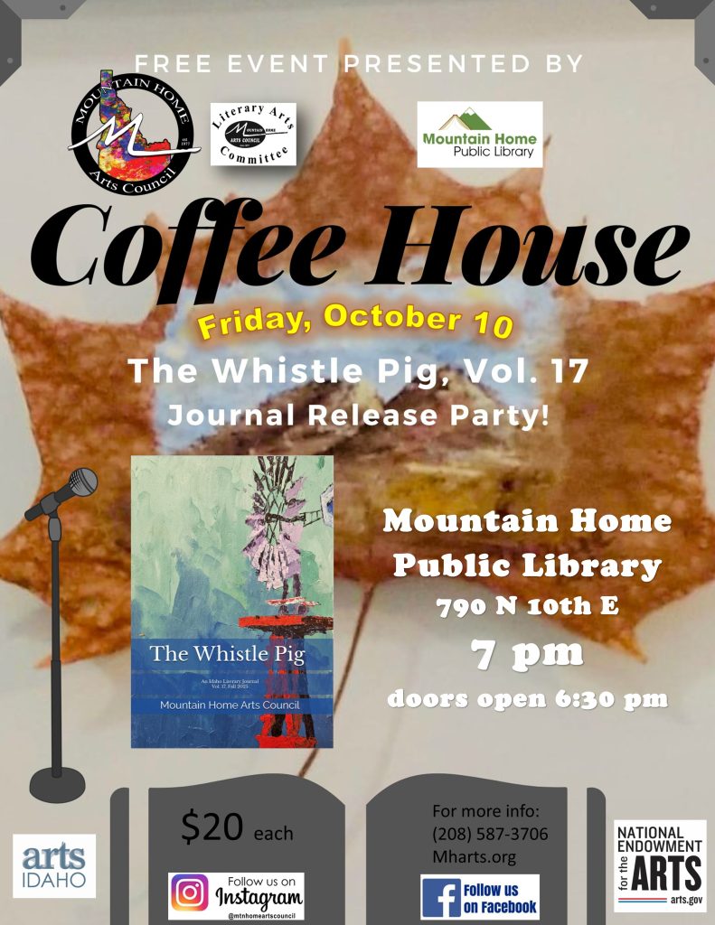 The Mountain Home Arts Council will debut the seventeenth volume of Idaho’s literary journal The Whistle Pig on Friday, Oct. 10, during the Fall Coffee House at the Mountain Home Public Library. This year’s volume features writing and visual art on the theme of The Power of Place. The program will be highlighted by author readings and visual art displays, and refreshments will be served. Doors open at 6:30 pm and the program will begin at 7 pm. The Whistle Pig ($20) showcases select local writers and artists and is published annually by the Literary Arts Committee of the Mountain Home Arts Council.